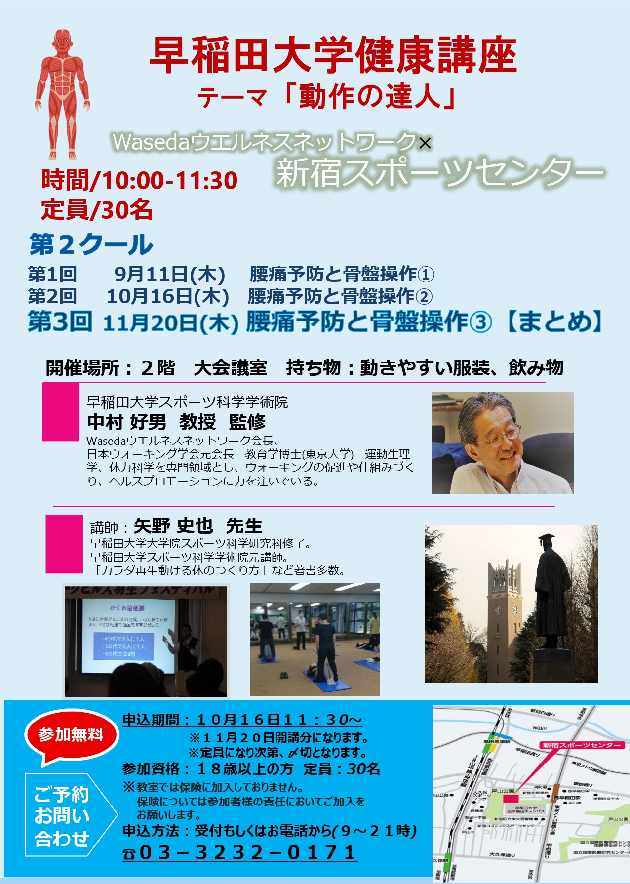 早稲田大学健康講座 第2クール【腰痛予防と骨盤操作③ 】を開講いたします。