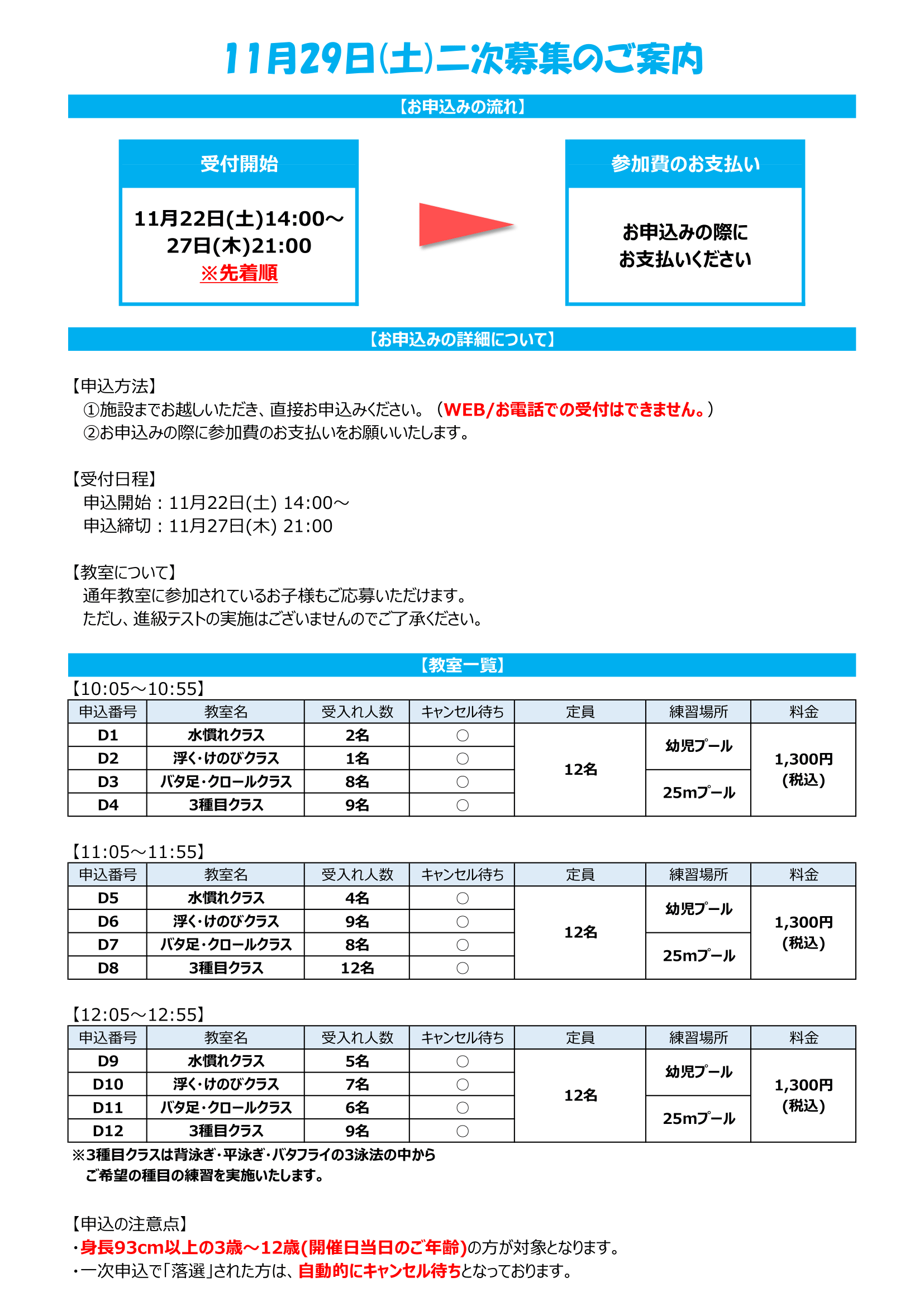 1Day水泳教室 二次募集受付期間:11/22(土)14:00~11/27(木)21:00