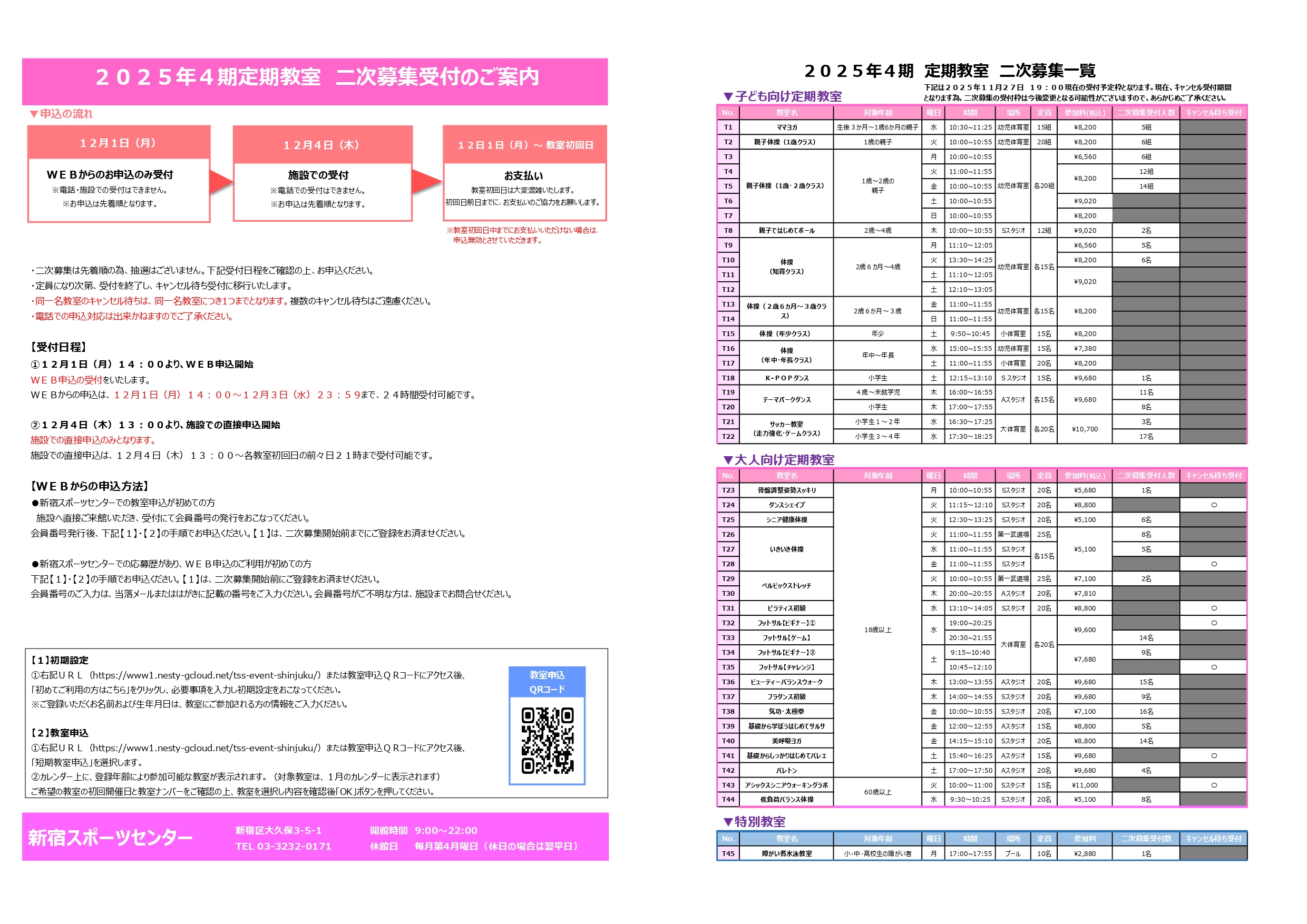 令和7年度第4期(1月~3月)定期教室二次募集要項