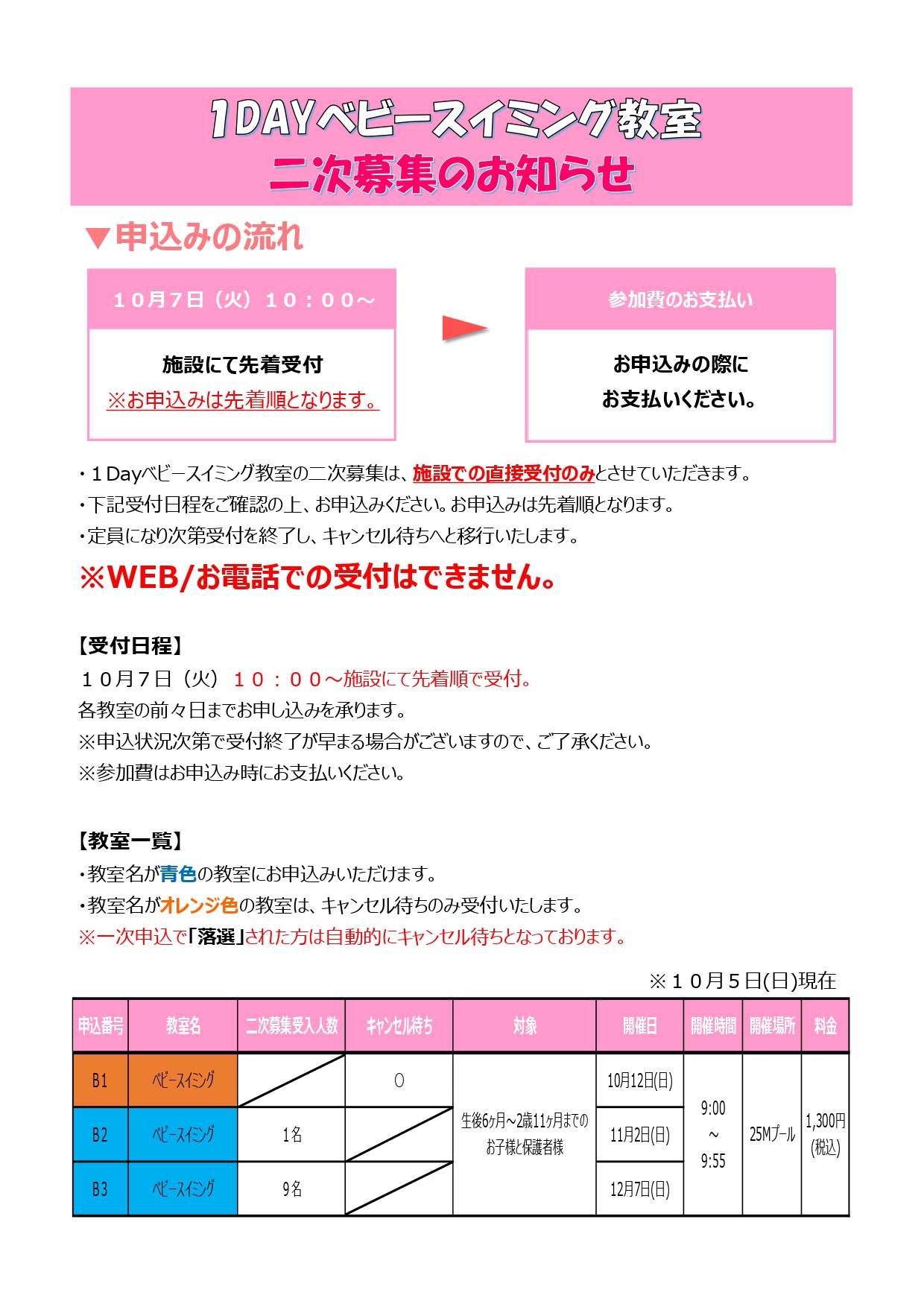 お知らせ詳細What's New HOME > お知らせ お知らせお知らせ一覧 1Dayベビー水泳教室2次募集のお知らせ 2025年10月5日 1Dayベビー水泳2次募集を10/7(火)10:00より行います。申込は施設先着となります。皆様のご応募、お待ちしております。 二次募集要項 一覧に戻る: お知らせ一覧 アーカイブ 2025年 2024年 2023年 2022年 2021年